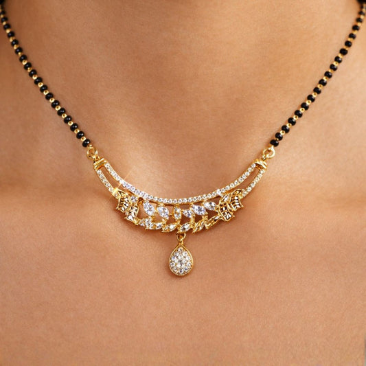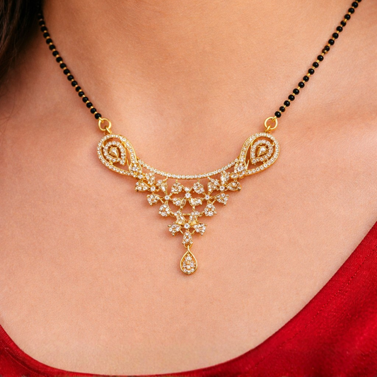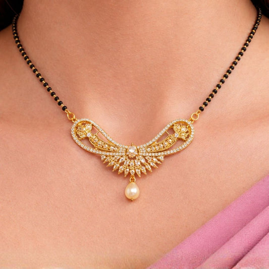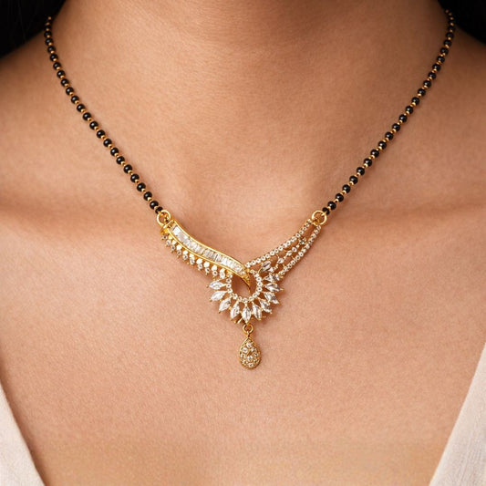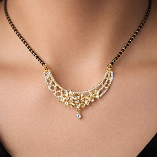 Material & Care: Material: Brass Plating: Gold-plated Beads: Traditional black beads Stone Type: AD & Cubic Zirconia Jewellery Type: AD gold plated jewellery, AD designer jewellery Packaging: Comes in a premium BELACI Jewellery Gift Box Note: Each piece is unique Mangalsutra Details: Weight: 9 gm Width: 3 cm Length: 50...