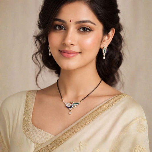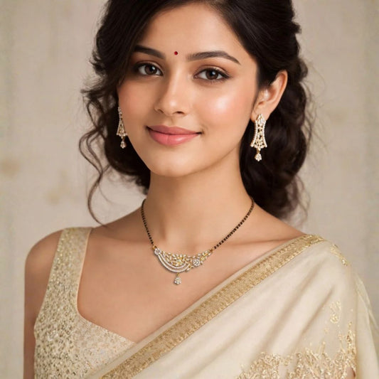 Material & Care: Material: Brass Plating: Gold-plated Beads: Traditional black beads Stone Type: AD & Cubic Zirconia Jewellery Type: AD gold plated jewellery, AD designer jewellery Packaging: Comes in a premium BELACI Jewellery Gift Box Note: Each piece is unique Mangalsutra Set Details: Weight: 8 gm Width: 2.5 cm Length:...