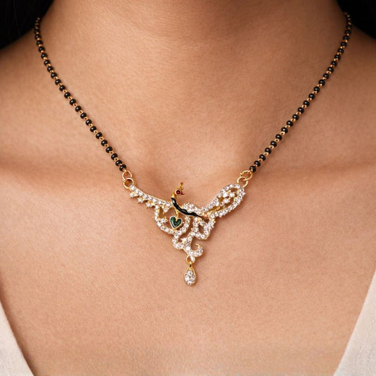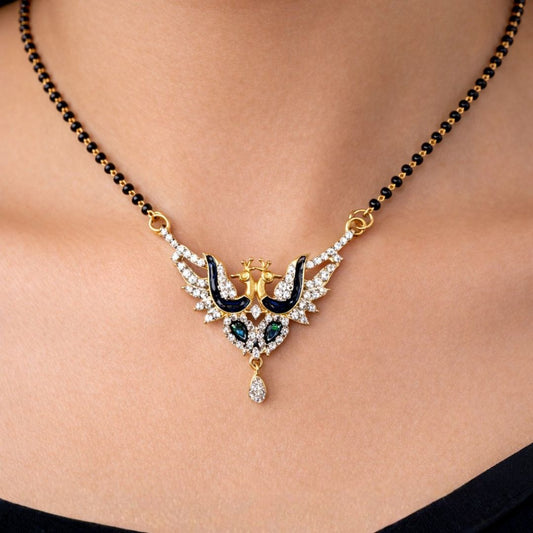 Material & Care: Material: Brass Plating: Gold-plated Beads: Traditional black beads Stone Type: AD & Cubic Zirconia Jewellery Type: AD gold plated jewellery, AD designer jewellery Packaging: Comes in a premium BELACI Jewellery Gift Box Note: Each piece is unique Mangalsutra Details: Weight: 15 gm Width: 3.7 cm Length: 54...