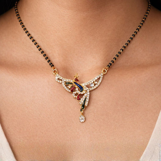 Material & Care: Material: Brass Plating: Gold-plated Beads: Traditional black beads Stone Type: AD, Cubic Zirconia & Enamel Work Jewellery Type: AD gold plated jewellery, AD designer jewellery Packaging: Comes in a premium BELACI Jewellery Gift Box Note: Each piece is unique Mangalsutra Details: Weight: 8 gm Width: 2.7 cm...