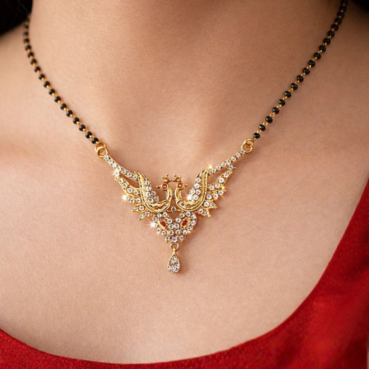 Material & Care: Material: Brass Plating: Gold-plated Beads: Traditional black beads Stone Type: AD, Cubic Zirconia & Synthetic Gemstones Jewellery Type: AD gold plated jewellery, AD designer jewellery Packaging: Comes in a premium BELACI Jewellery Gift Box Note: Each piece is unique Mangalsutra Details: Weight: 7 gm Width: 2.7 cm...