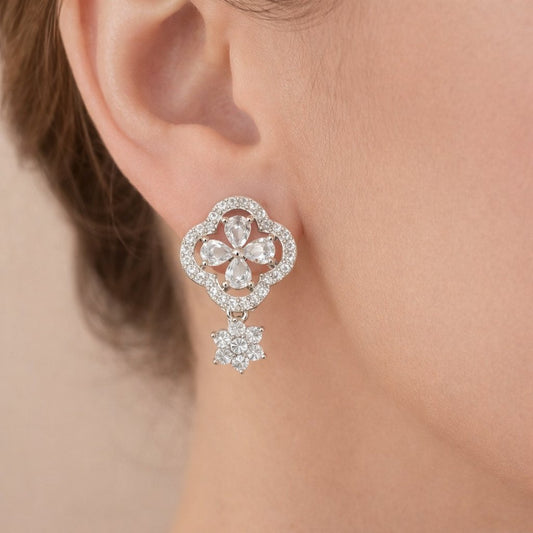 Material & Care: Material: Brass Plating: Silver-toned Stone Type: AD & Cubic Zirconia Jewellery Type: AD silver jewellery, AD designer jewellery Packaging: Comes in a premium BELACI Jewellery Gift Box Note: Each piece is unique Earring Details: Weight: 2 gm Width: 1.5 cm Length: 2 cm Design: Clover-shaped frame with...