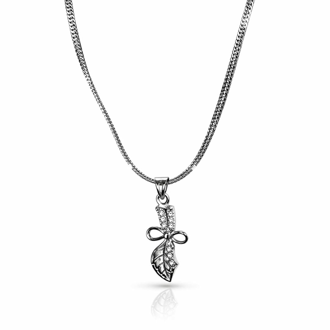Graceful and refined, this AD silver jewellery set features a leaf-inspired pendant with a bow accent, adorned with sparkling American Diamonds, and matching earrings for a coordinated look. The intricate detailing and radiant finish make it ideal for weddings, festive occasions, or evening wear. Crafted with a rhodium finish, this set blends timeless elegance with modern sophistication.